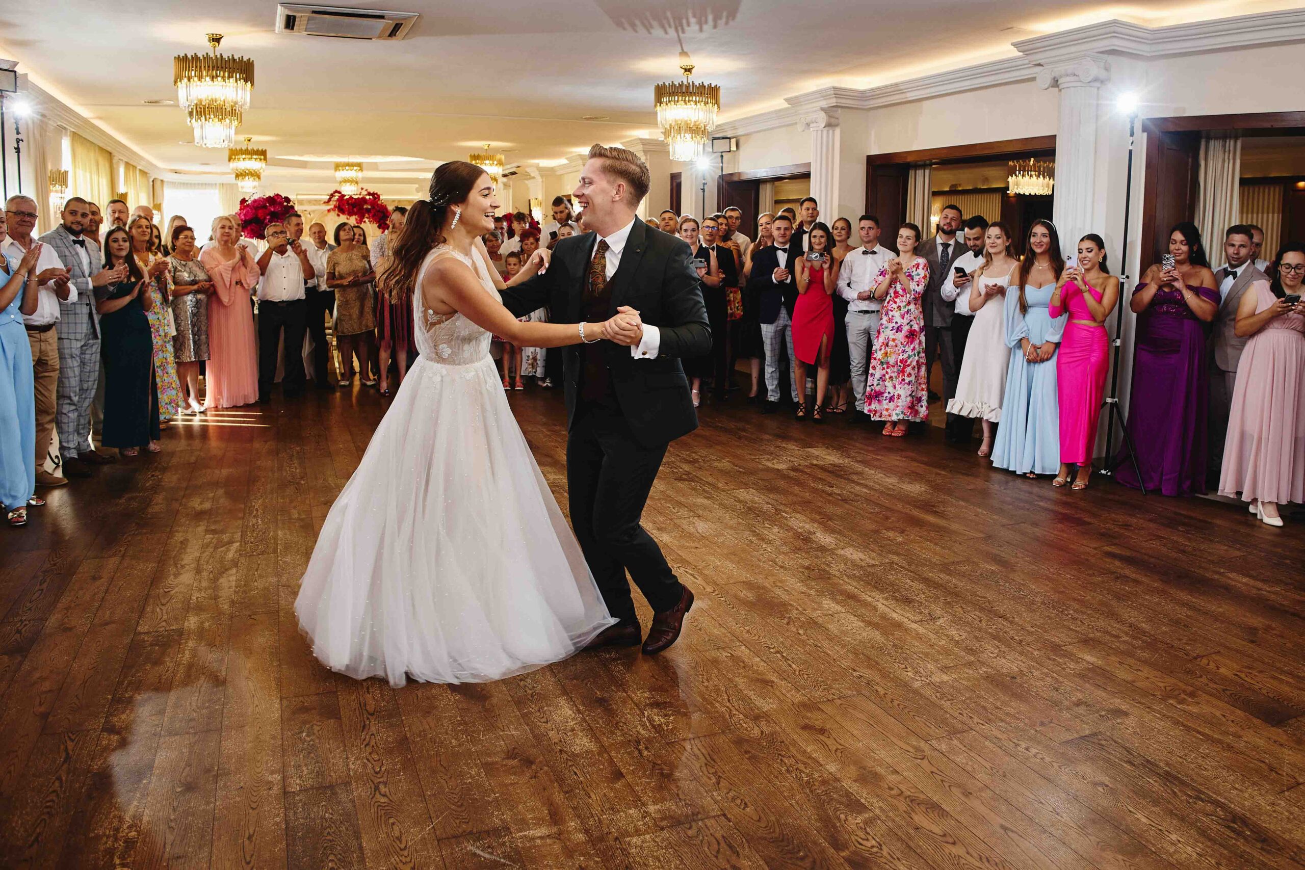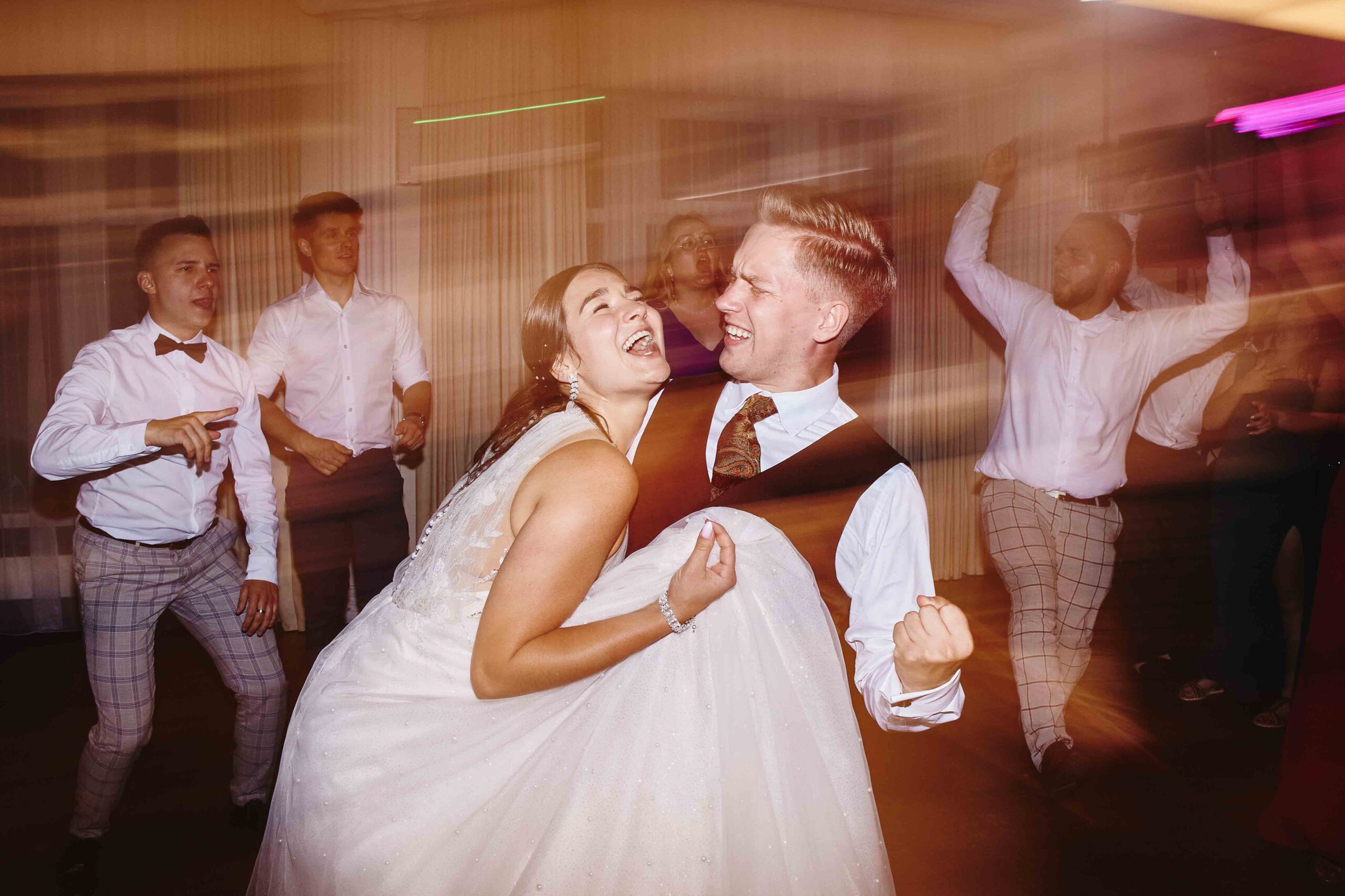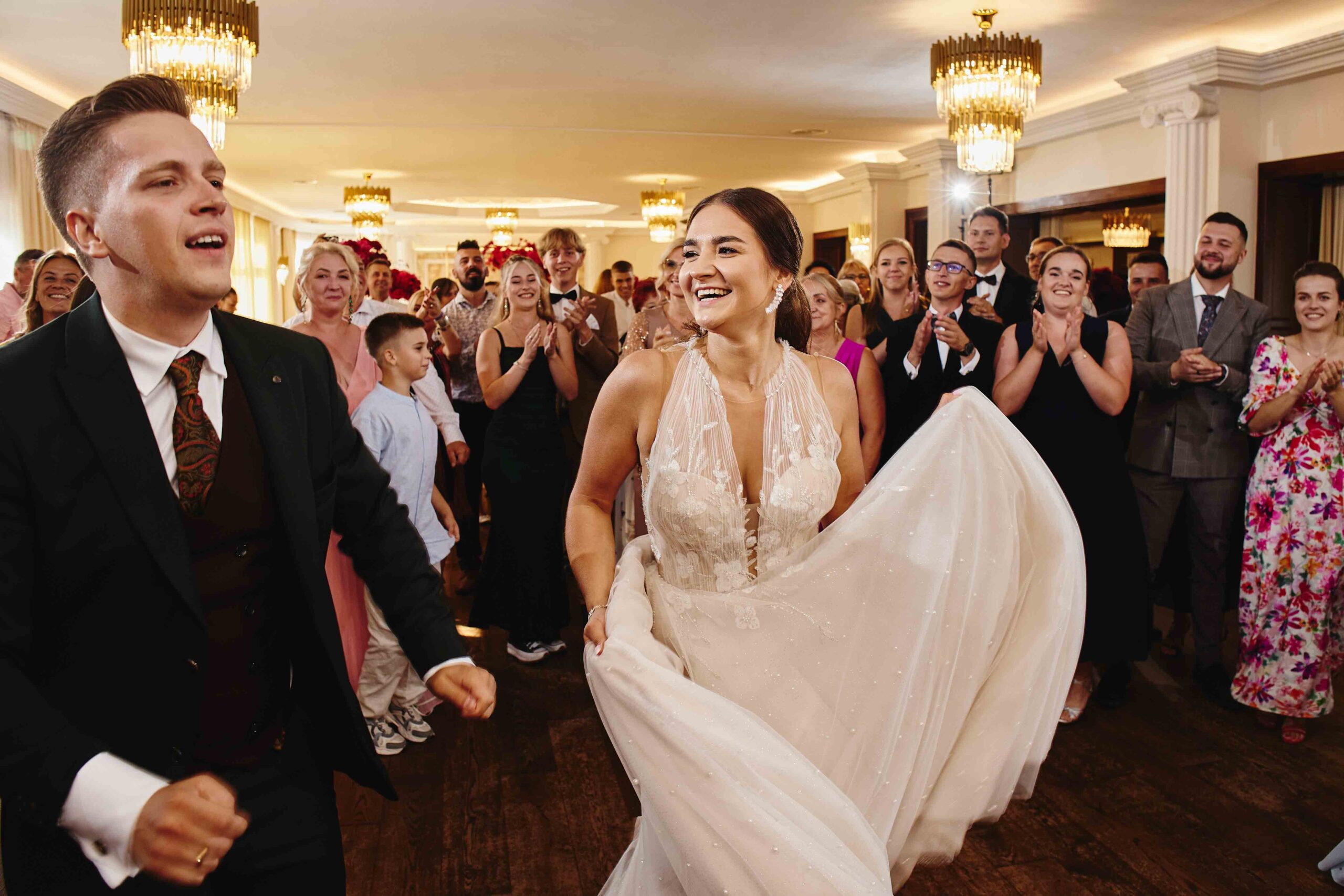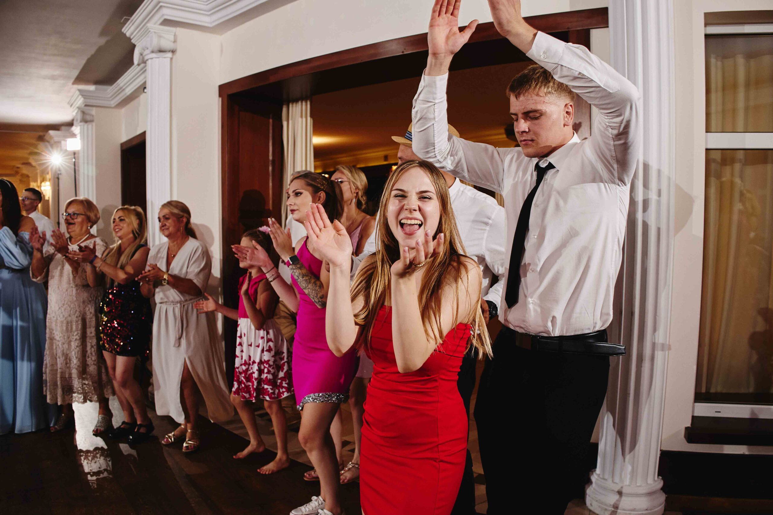 Goście, od samego początku nastawieni na dobrą zabawę, dali z siebie wszystko na parkiecie – klimat był totalnie szalony, a muzyka niosła się aż za okna. Bez stresu, bez zbędnego pośpiechu, wszyscy po prostu cieszyli się chwilą i miłością, którą Paulina i Kacper wręcz zarażali.