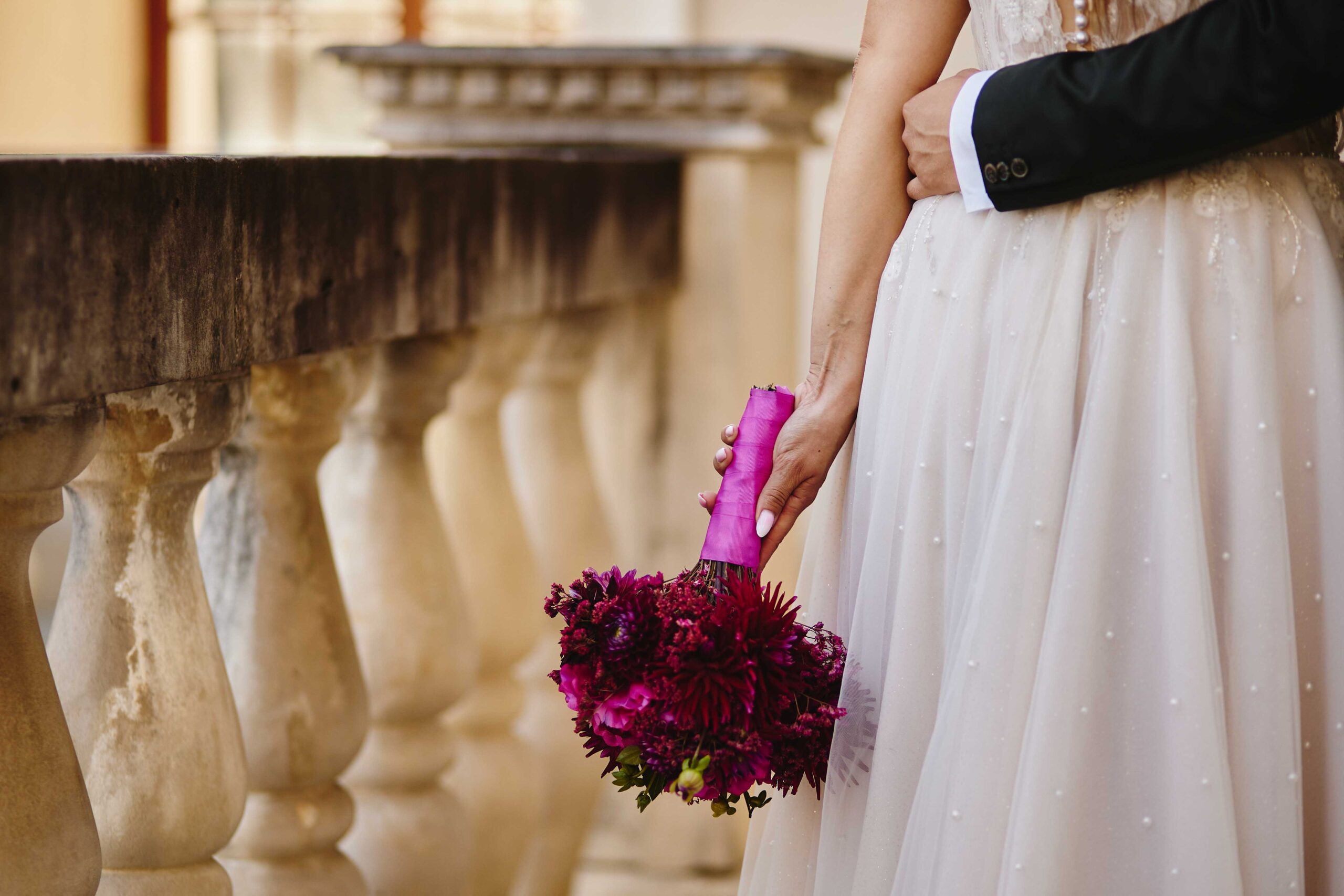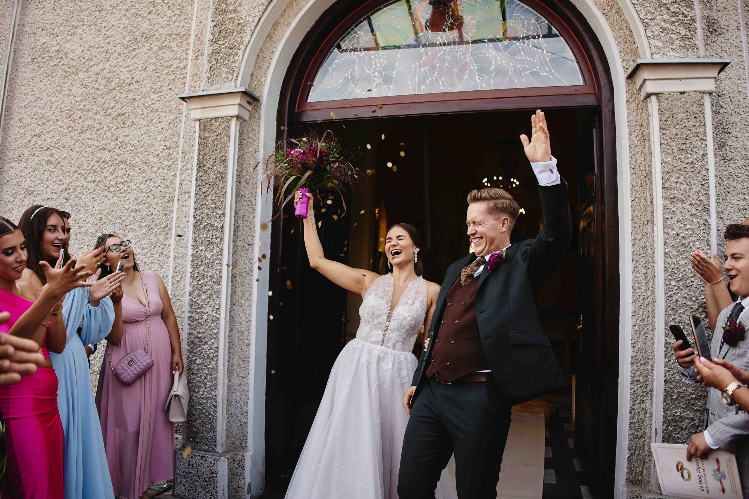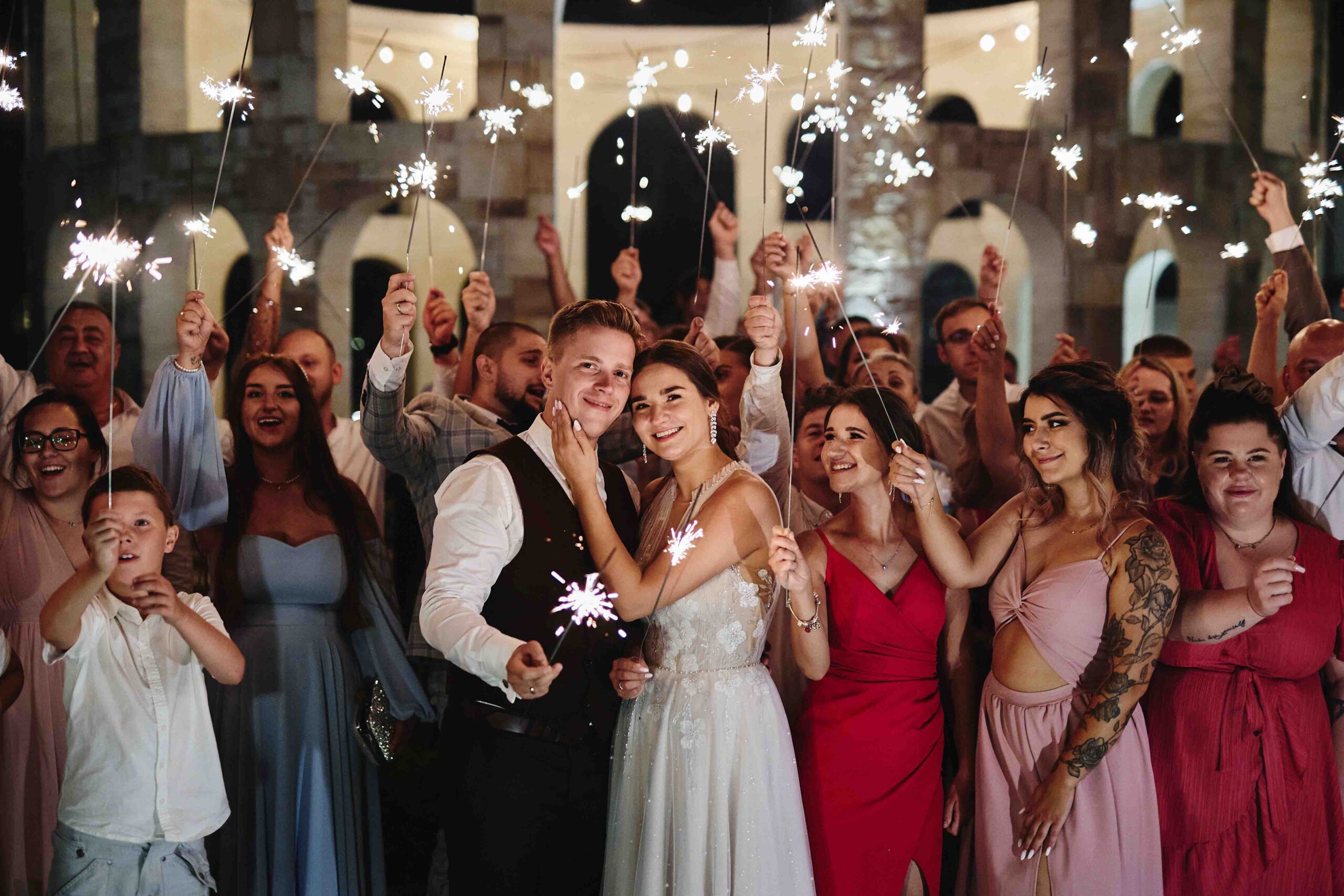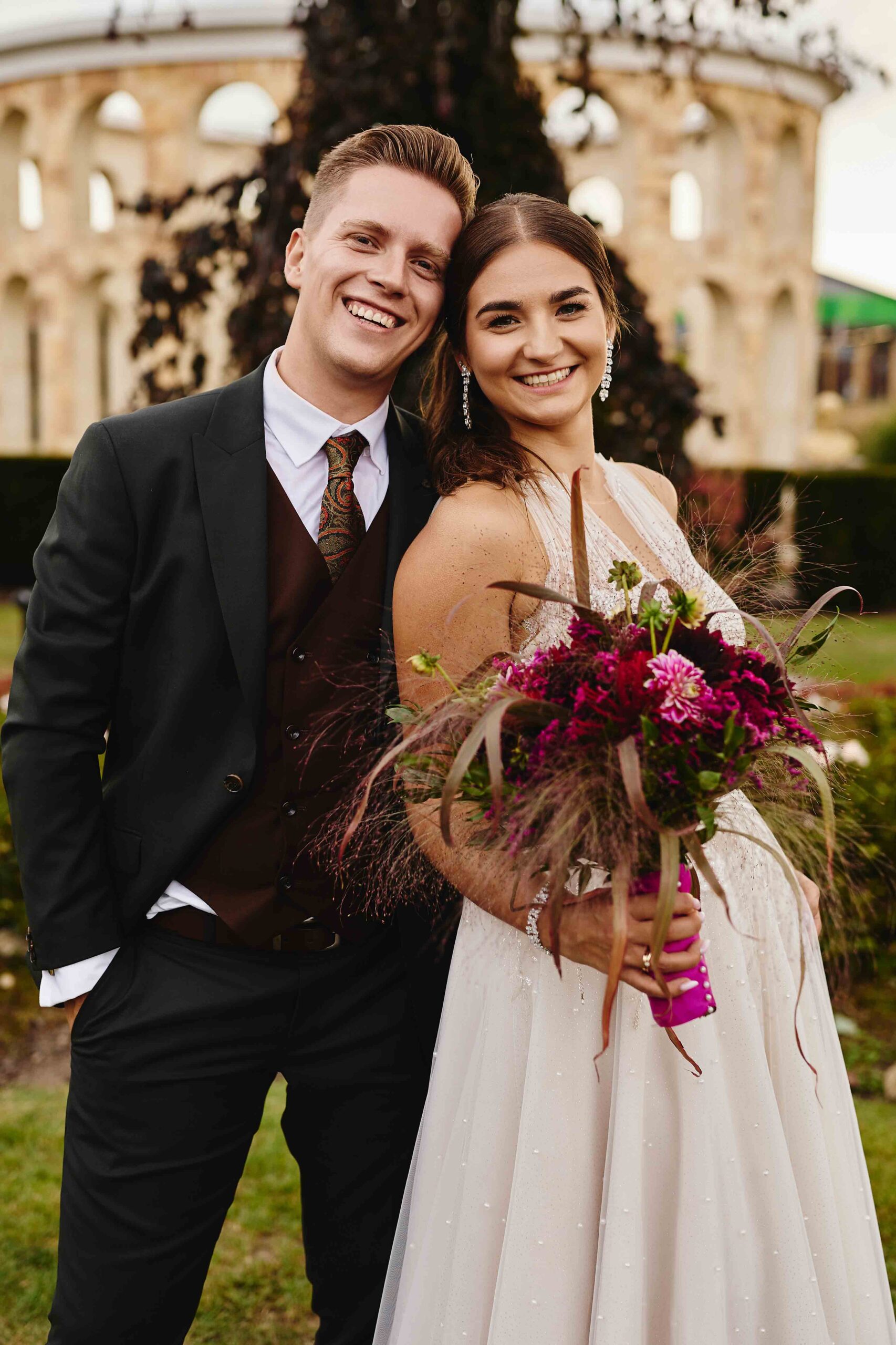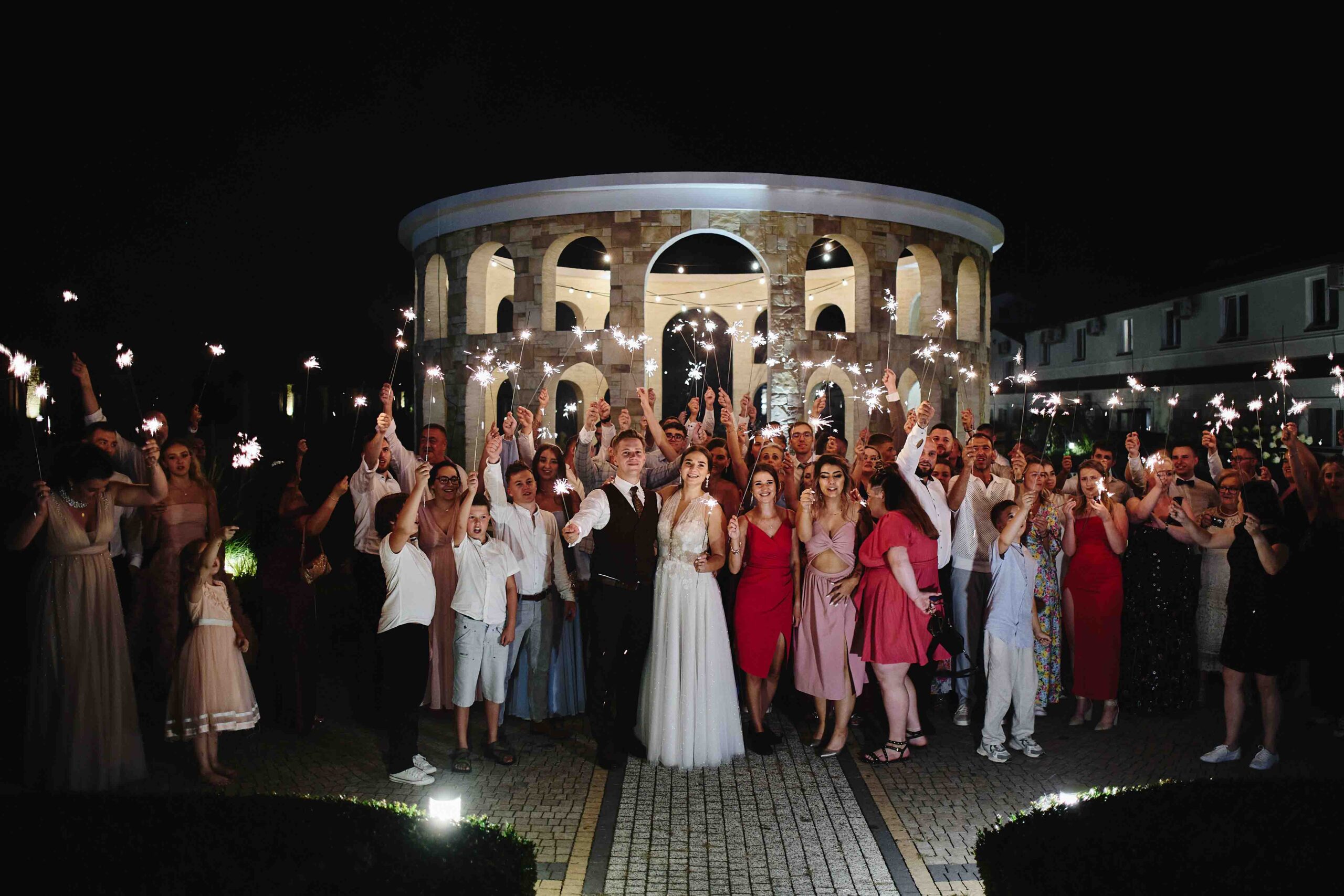 Kolorem przewodnim tego pięknego dnia był róż – idealnie dopasowany do bukietu Panny Młodej, który wyglądał jak wyjęty z bajki. Wszystko było spójne, eleganckie, a jednocześnie z nutą świeżości i luzu. Sala weselna Koloseum w Jarosławiu, z majestatyczną fasadą, nadała całości wyjątkowego charakteru – zwłaszcza wieczorem, kiedy oświetliliśmy ją zimnymi ogniami, tworząc widowiskowe kadry. ✨