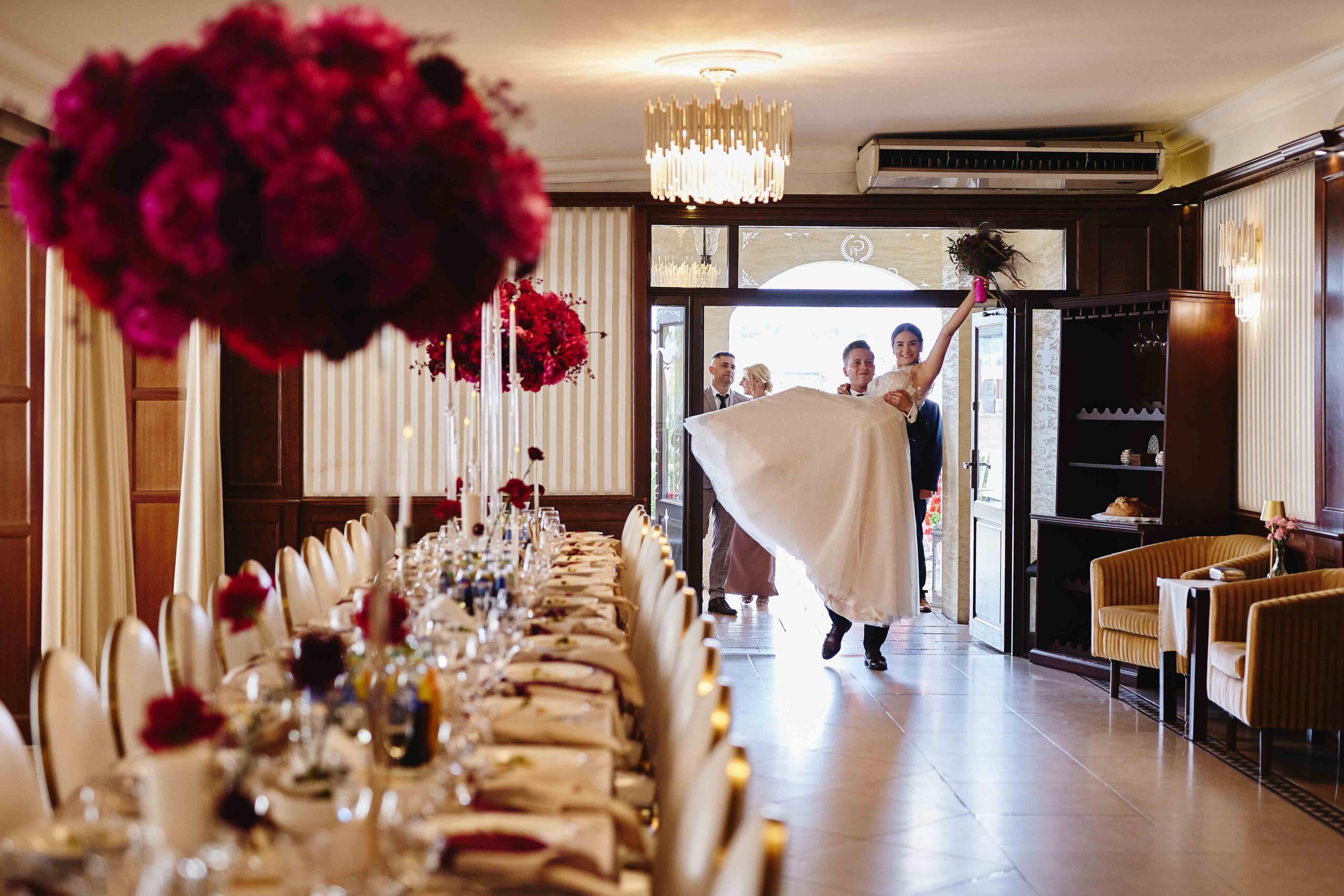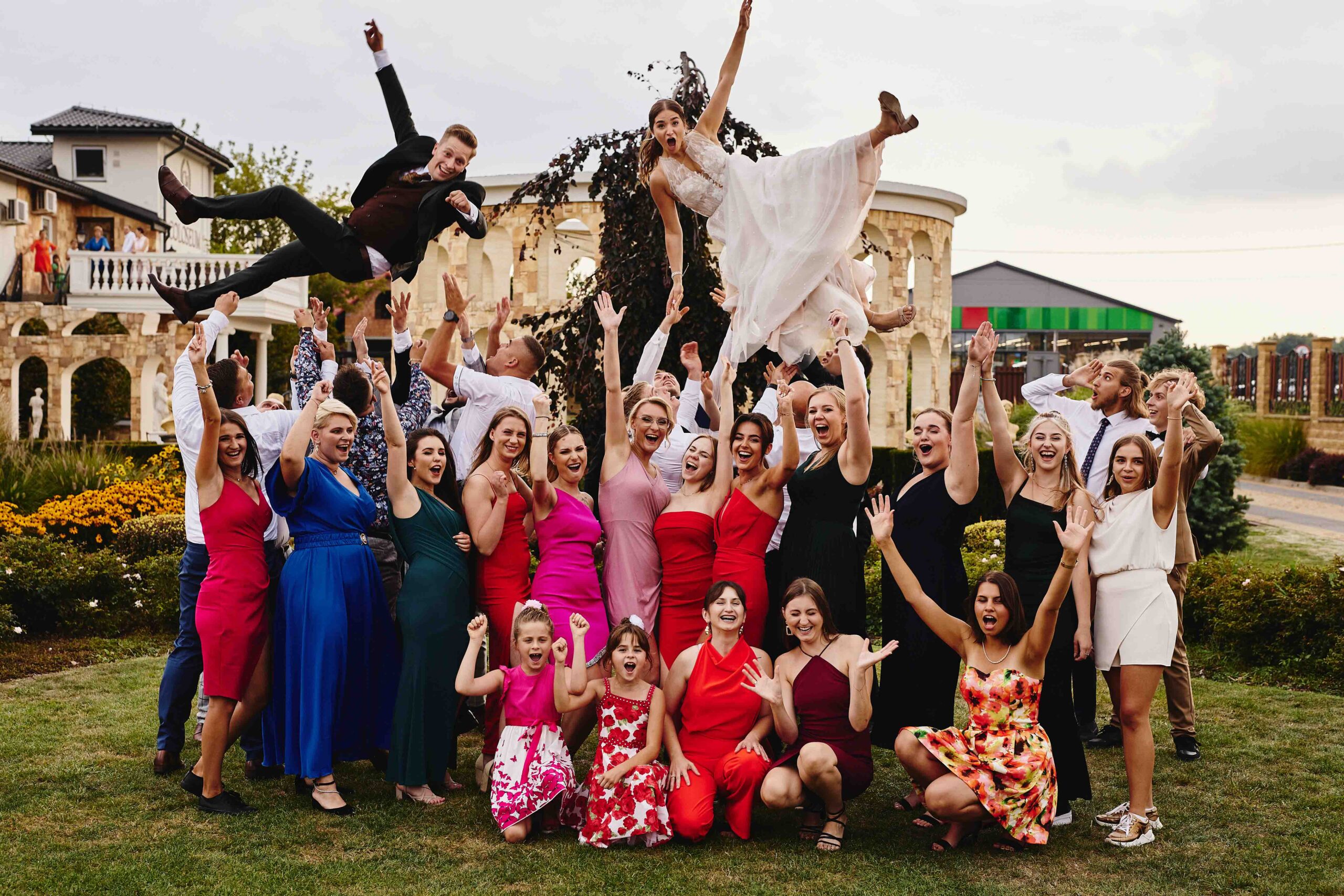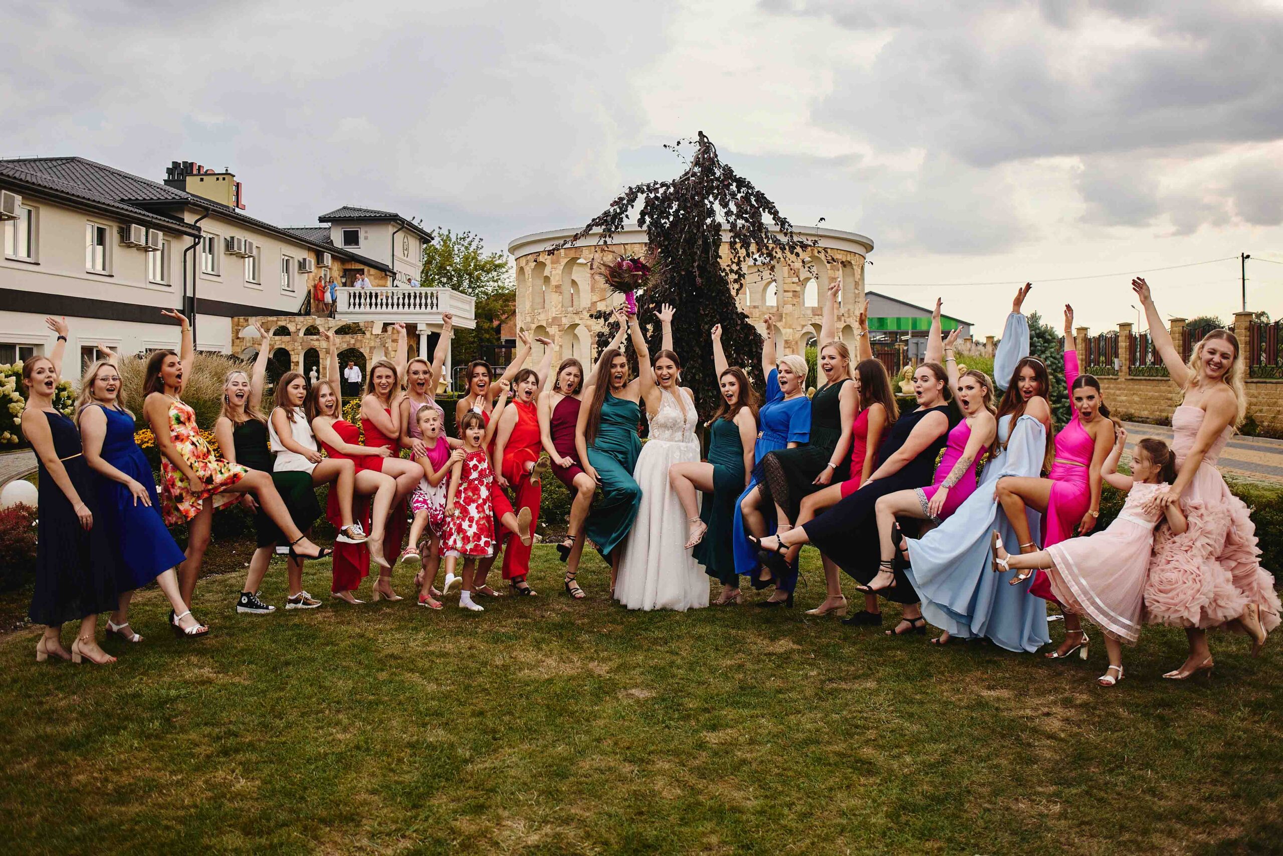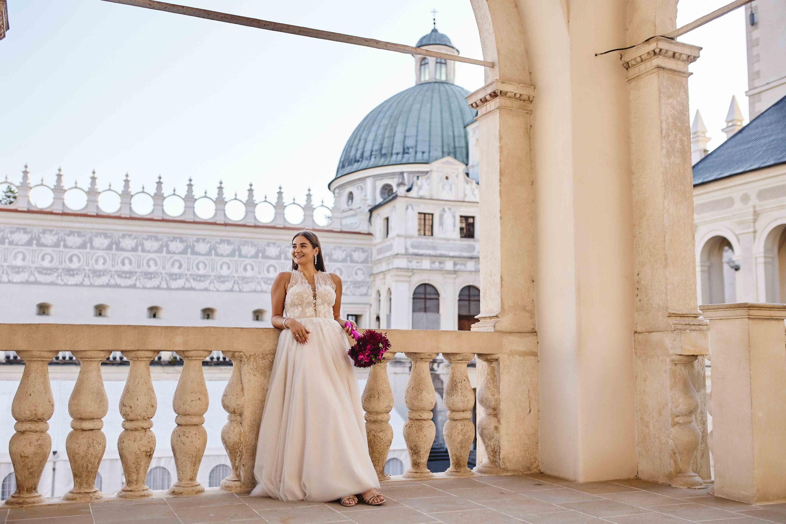 Kolorem przewodnim tego pięknego dnia był róż – idealnie dopasowany do bukietu Panny Młodej, który wyglądał jak wyjęty z bajki. Wszystko było spójne, eleganckie, a jednocześnie z nutą świeżości i luzu. Sala weselna Koloseum w Jarosławiu, z majestatyczną fasadą, nadała całości wyjątkowego charakteru – zwłaszcza wieczorem, kiedy oświetliliśmy ją zimnymi ogniami, tworząc widowiskowe kadry. ✨